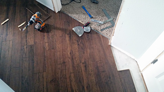 Bryan tried installing the flooring both with a door jamb installed and with it completely removed. Although he thought he would save a little time but not removing the jamb, he ultimately decided it was much easier to just take them out all together until the floors were done. Above is our guest bedroom door with the jamb still attached. The floor needed to run under the jamb, so the jamb had to be shortened with our oscillating tool to slide over the top of the floors (ultimately making it easier to just remove future doors).